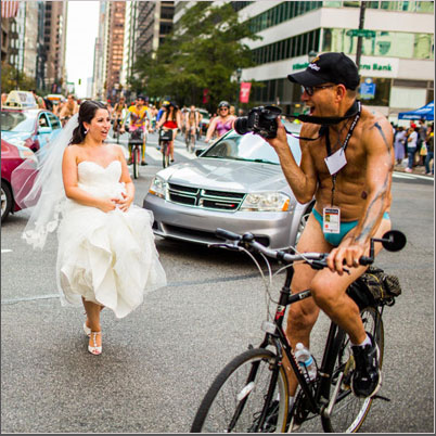 一袭白纱的新娘走来了,不过你看之前要小心眼睛,因为在她身旁,3000名单车骑士一丝不挂,这可是抢戏得很。